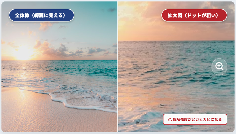 スマホの画面サイズ(数センチ)で綺麗に見えるAI画像も、A4のチラシやA2のポスターサイズに引き伸ばして印刷すると、画質が粗くなりモザイクのようになってしまいます。