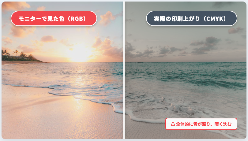 多くの場合、印刷会社のシステムが「これはインク(CMYK)で出せない色だから、一番近いインクの色に無理やり変換しよう」と自動で処理を行います。機械による強制的な変換が行われるため、先ほど比較画像でお見せしたような「全体的に暗く、濁ったような色」へ意図せず変わってしまうのです。